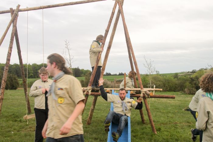 Die erste Bedingung für die Rückverwandlung gingen die Pfadfinder am Freitag an. Mit Hilfe von Lagerbauten, wurde ein Lagerplatz errichten dem es an nichts fehlte. Es wurden ein Bannermast errichtet, ebenso wie Kerzenständer angefertigt und auf dem Platz verteilt und ein Spielplatz samt Rutsche und Balancierbalken aufgebaut.